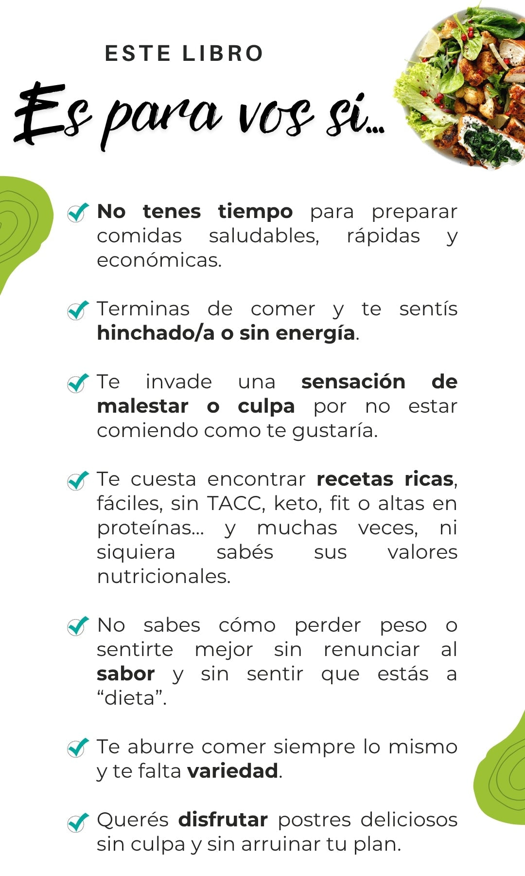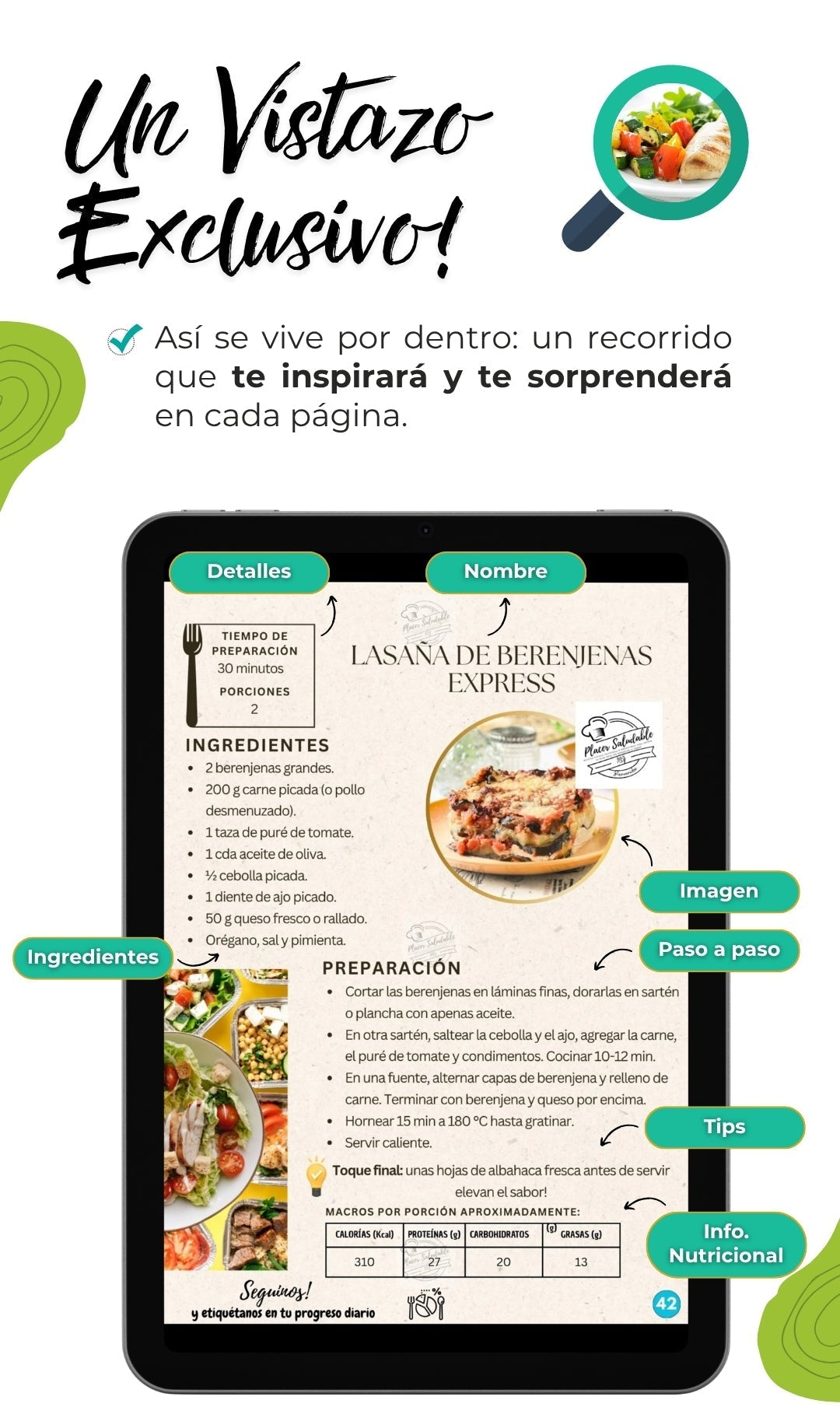 Cada receta viene con los macros exactos: calorías, proteínas, carbohidratos y grasas. Vas a poder planificar tus comidas como un experto, sin perder tiempo calculando nada.